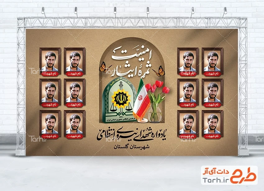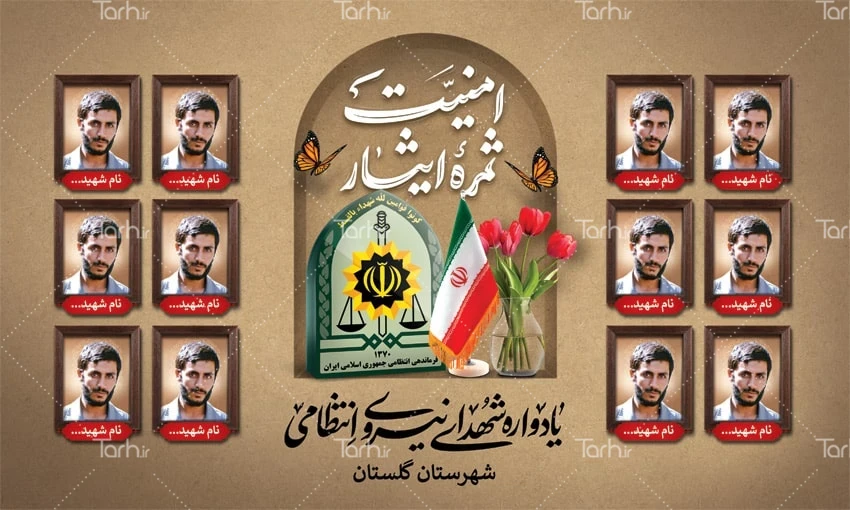 طرح لایه باز بنر یادواره شهدای نیروی انتظامی با فرمت psd و قابل ویرایش در نرم افزار فتوشاپ به صورت لایه باز توسط تیم طراحان طرح دات آی آر طراحی شده است. در طرح لایه باز بنر یادواره شهدا نیروی انتظامی از تصاویر و المان های با کیفیت و متناسب با استاندارد چاپ استفاده گردیده است. طرح بنر یادواره شهدای نیرو انتظامی شامل تایپوگرافی امنیت ثمره ایثار و جایگاه عکس شهدا می باشد که المان های استفاده شده در بنر لایه باز یادواره شهدا نیرو انتظامی قابلیت ویرایش، جابه جایی و تغییر سایز را دارا بوده و شما می توانید متناسب با سلیقه خودتان طرح یادواره شهدا نیروی انتظامی را ویرایش نمایید.