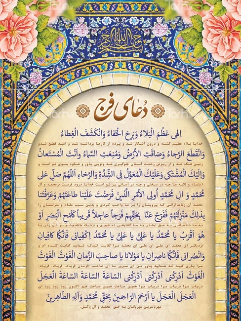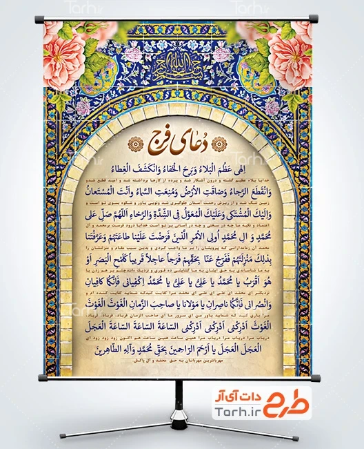 بنر خام دعای فرج لایه باز شامل خوشنویسی دعای الهی عظم البلاء و وکتور گل و طرح کاشی کاری جهت چاپ بنر دعای الهی عظم البلاء و چاپ بنر دعای فرج امام زمان (عج)