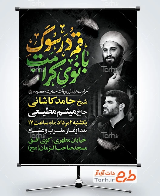 طرح بنر اطلاعیه رحلت حضرت معصومه با فرمت psd و قابل ویرایش در نرم افزار فتوشاپ به صورت لایه باز توسط تیم طراحان طرح دات آی آر طراحی شده است. در طرح بنر شهادت حضرت معصومه از تصاویر و المان های با کیفیت و متناسب با استاندارد چاپ استفاده گردیده است. طرح لایه باز بنر اطلاع رسانی شهادت حضرت معصومه شامل خوشنویسی قم در سوگ بانوی کرامت و وکتور پر می باشد که المان های استفاده شده در پوستر لایه باز وفات حضرت معصومه قابلیت ویرایش، جابه جایی و تغییر سایز را دارا بوده و شما می توانید متناسب با سلیقه خودتان طرح پوستر اطلاعیه وفات حضرت معصومه را ویرایش نمایید.