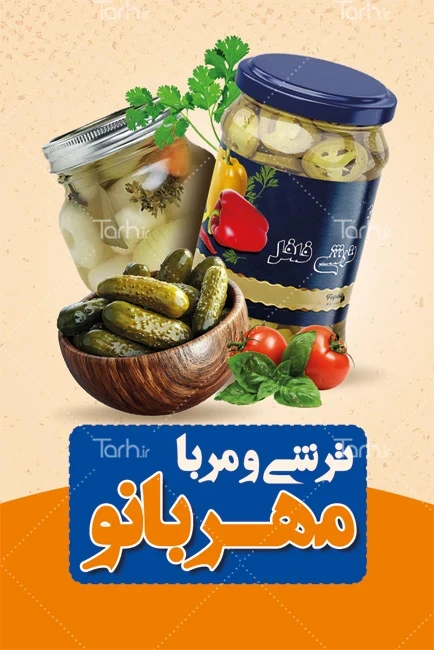 طرح کارت ویزیت تبلیغاتی مربا و ترشی فروشی دارای عکس خیارشور و ترشی کد فایل 1853694