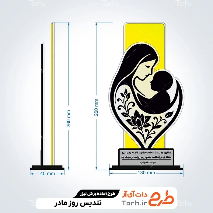 طرح آماده تندیس روز مادر با نرم افزار Corel Draw به صورت لایه باز و قابل ویرایش توسط تیم طراحان طرح دات آی آر طراحی شده است. در طرح آماده لیزر تندیس روز مادر نکات مهم طراحی لیزر تندیس مانند رعایت ضخامت چوب، ابعاد استاندارد طرح و چیدمان درست برای کمترین پرتی رعایت گردیده است. طرح برش لیزری تندیس روز مادر آماده اجرا توسط دستگاه های برش، سی ان سی (CNC)، حکاکی لیزر و حکاکی روی چوب میباشد. شما میتوانید از طرح تندیس لیزری روز مادر جهت تولید انواع طرح تندیس مذهبی و استند روز مادر به عنوان هدیه و یادبود به مناسبت این روز مهم برای مادران و زنان افتخار آفرین استفاده کنید.