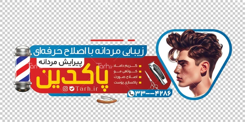 طرح آماده استیکر آرایشگاه آقایان با فرمت psb و قابل ویرایش در نرم افزار فتوشاپ به صورت لایه باز توسط تیم طراحان طرح دات آی آر طراحی شده است. در طرح استیکر تبلیغاتی مغازه سلمانی از تصاویر و المان های با کیفیت و متناسب با استاندارد چاپ استفاده شده، همچنین نکات مهم در طرح لایه باز استیکر آرایشگاه مردانه مانند رنگ بندی، رعایت حاشیه، فاصله ها، سایز و نوع فونت مناسب طراحی استیکر و ... رعایت گردیده است. طرح برچسب روی شیشه آرایشگاه مردانه شامل عنوان آرایشگاه و عکس مدل مرد می باشد و المان های استفاده شده در طرح استیکر آرایشگاه و پیرایش مردانه قابلیت ویرایش، جابه جایی و تغییر سایز را دارا بوده و شما می توانید متناسب با سلیقه خودتان طرح برچسب دیواری آرایشگاه مردانه را ویرایش نمایید، همچنین با تغییر تصاویر و متن ها می توانید طرح استیکر آرایشگاه آقایان را به طرح استیکر شغل مورد نظر خود تبدیل نمایید.