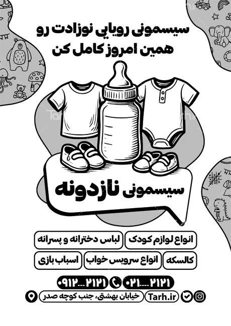 ابعاد تراکت تبلیغاتی سیاه و سفید سیسمونی فروشی در جدول ویژگیهای فایل درجشده و با توجه به لایه باز بودن و کیفیت بالای طرح تراکت ریسو فروشگاه سیسمونی، قابلیت ویرایش و تبدیل به سایز دلخواه، همچنین چاپ روی متریالهای مختلف مانند انواع کاغذ، گلاسه، کاغذ الوان و ... را دارا میباشد. همچنین میتوان طرح سیاه سفید لباس کودک را در زمینه های چاپ سیلک ، نایلون، ساک دستی، پاکت دستی و کیسه نیز استفاده کرد. تراکت های سیاه سفید یا ریسو یک ابزار تبلیغاتی بسیار موثر محسوب می شوند و به دلیل هزینه کم و تأثیر بالا، در بسیاری از کسب و کارها به عنوان روشی اقتصادی و موثر برای انتقال اطلاعات به مخاطبان برای تبلیغات و رویدادهای مختلف استفاده میشوند.