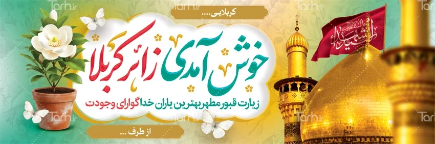 طرح لایه باز پلاکارد خیرمقدم زائرین کربلا با فرمت psd و قابل ویرایش در نرم افزار فتوشاپ به صورت لایه باز توسط تیم طراحان طرح دات آی آر طراحی شده است. در طرح لایه باز بنر خوش آمدگویی زائرین کربلا از تصاویر و المان های با کیفیت و متناسب با استاندارد چاپ استفاده گردیده است. طرح لایه باز بنر خیر مقدم کربلا شامل خوشنویسی خوش آمدی زائر کربلا، عکس گنبد حرم امام حسین و وکتور گل می باشد که المان های استفاده شده در بنر لایه باز خوش آمد گویی قابلیت ویرایش، جابه جایی و تغییر سایز را دارا بوده و شما می توانید متناسب با سلیقه خودتان طرح خیرمقدم را ویرایش نمایید.