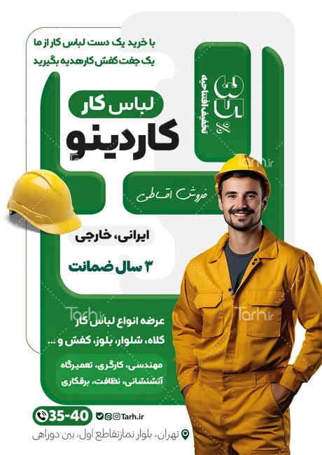 نمونه تراکت فروشگاه لباس کار با فرمت psd و قابل ویرایش در نرمافزار فتوشاپ بهصورت لایه باز توسط تیم طراحان طرح دات آی آر طراحی شده است. در نمونه تراکت لباس کار از تصاویر و المانهای باکیفیت و متناسب با استاندارد چاپ استفادهشده، همچنین نکات مهم در طرح تراکت لباس کار مانند رنگبندی، رعایت حاشیه، فاصلهها، فضای کافی برای درج متن، سایز و نوع فونت مناسب طراحی تراکت و ... رعایت گردیده است. طرح لایه باز تراکت تولیدی لباس کار شامل عکس لباس کار میباشد که المانهای استفادهشده در طرح تراکت تولیدی لباس کار قابلیت ویرایش، جابهجایی و تغییر سایز را دارا بوده و شما میتوانید متناسب باسلیقه خودتان تراکت لایه باز لباس کار را ویرایش نمایید، همچنین با تغییر تصاویر و متنها میتوانید طرح لایه باز تراکت فروشگاه لباس کار را به طرح تراکت کسب و کار مد نظر خود شخصی سازی نمایید.