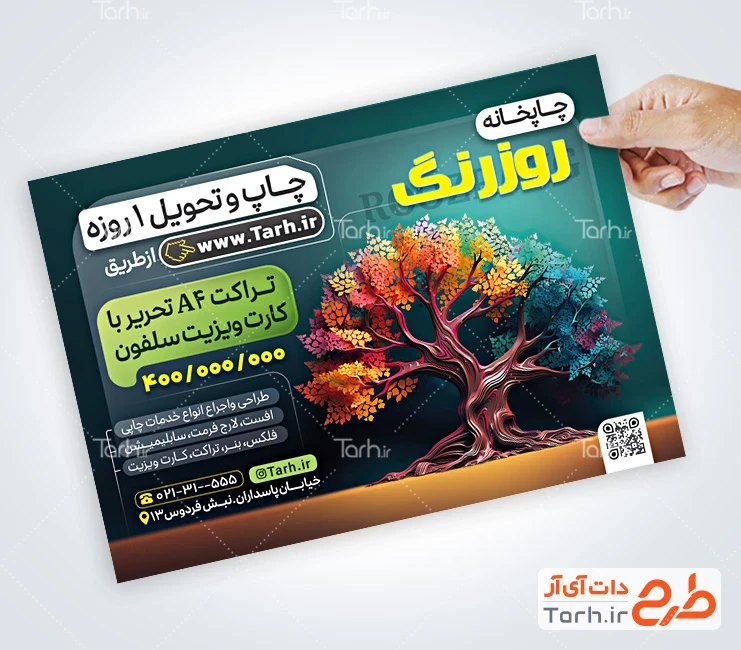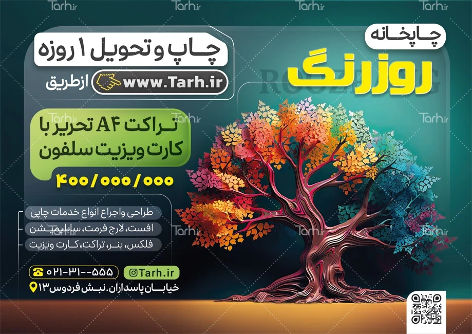نمونه تراکت آماده چاپخانه با فرمت psd و قابل ویرایش در نرمافزار فتوشاپ بهصورت لایه باز توسط تیم طراحان طرح دات آی آر طراحی شده است. در نمونه تراکت چاپ خانه از تصاویر و المانهای باکیفیت و متناسب با استاندارد چاپ استفادهشده، همچنین نکات مهم در طرح تراکت چاپخانه مانند رنگبندی، رعایت حاشیه، فاصلهها، فضای کافی برای درج متن، سایز و نوع فونت مناسب طراحی تراکت و ... رعایت گردیده است. طرح لایه باز تراکت چاپخانه شامل عکس درخت رنگی میباشد که المانهای استفادهشده در طرح تراکت چاپ و تبلیغات قابلیت ویرایش، جابهجایی و تغییر سایز را دارا بوده و شما میتوانید متناسب باسلیقه خودتان تراکت لایه باز چاپخانه را ویرایش نمایید، همچنین با تغییر تصاویر و متنها میتوانید طرح تراکت چاپ دیجیتال را به طرح تراکت کسب و کار مد نظر خود شخصی سازی نمایید.