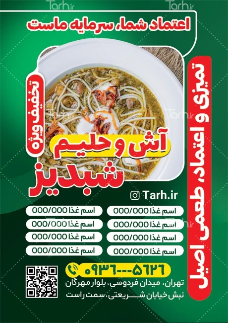 نمونه تراکت آش و حلیم فروشی با فرمت psd و قابل ویرایش در نرمافزار فتوشاپ بهصورت لایه باز توسط تیم طراحان طرح دات آی آر طراحی شده است. در نمونه تراکت آش و حلیم از تصاویر و المانهای باکیفیت و متناسب با استاندارد چاپ استفادهشده، همچنین نکات مهم در طرح تراکت آش و حلیم مانند رنگبندی، رعایت حاشیه، فاصلهها، فضای کافی برای درج متن، سایز و نوع فونت مناسب طراحی تراکت و ... رعایت گردیده است. طرح لایه باز تراکت آش فروشی شامل عکس کاسه آش میباشد که المانهای استفادهشده در طرح تراکت آش فروشی قابلیت ویرایش، جابهجایی و تغییر سایز را دارا بوده و شما میتوانید متناسب باسلیقه خودتان تراکت لایه باز آش و حلیم را ویرایش نمایید، همچنین با تغییر تصاویر و متنها میتوانید طرح پوستر تبلیغاتی حلیم فروشی را به طرح تراکت کسب و کار مد نظر خود شخصی سازی نمایید.