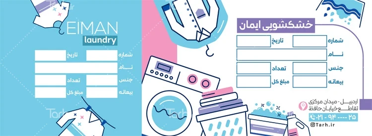 فایل لایه باز قبض خشک شویی با فرمت psd و قابل ویرایش در نرمافزار فتوشاپ بهصورت لایه باز توسط تیم طراحان طرح دات آی آر طراحی شده است. در نمونه قبض خشکشویی از تصاویر و المانهای باکیفیت و متناسب با استاندارد چاپ استفادهشده، همچنین نکات مهم در طرح قبض رسید خشک شویی مانند رنگبندی، رعایت حاشیه، فاصلهها، فضای کافی برای درج متن، سایز و نوع فونت مناسب قبض خشکشویی خام و ... رعایت گردیده است. طرح لایه باز قبض خشک شویی شامل جایگاه مشخصات شرکت و وکتور ماشین لباسشویی میباشد که المانهای استفادهشده در فرم خام قبض خشک شویی قابلیت ویرایش، جابهجایی و تغییر سایز را دارا بوده و شما میتوانید متناسب باسلیقه خودتان قبض لایه باز خشکشویی را ویرایش نمایید، همچنین با تغییر تصاویر و متنها میتوانید طرح قبض رسید خشکشویی لایه باز را به طرح قبض کسب و کار مد نظر خود شخصی سازی نمایید.