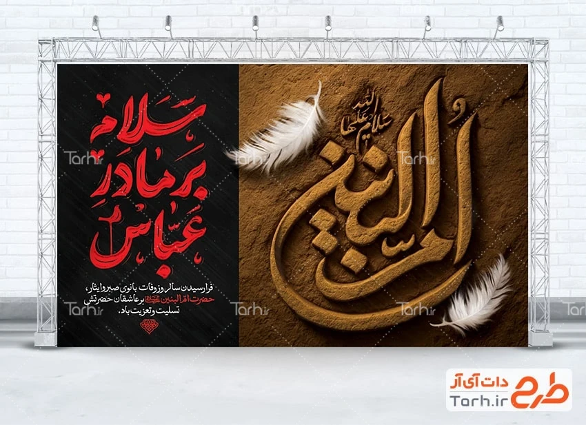 طرح بنر پشت سن وفات حضرت ام البنین با فرمت psd و قابل ویرایش در نرم افزار فتوشاپ به صورت لایه باز توسط تیم طراحان طرح دات آی آر طراحی شده است. در پشت منبری لایه باز وفات ام البنین از تصاویر و المان های با کیفیت و متناسب با استاندارد چاپ استفاده گردیده است. بنر پشت منبری وفات ام البنین شامل تایپوگرافی ام البنین، سلام بر مادر عباس و عکس پر می باشد که المان های استفاده شده در طرح بنر لایه باز رحلت حضرت ام البنین قابلیت ویرایش، جابه جایی و تغییر سایز را دارا بوده و شما می توانید متناسب با سلیقه خودتان طرح لایه باز بنر وفات ام البنین را ویرایش نمایید.