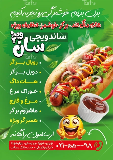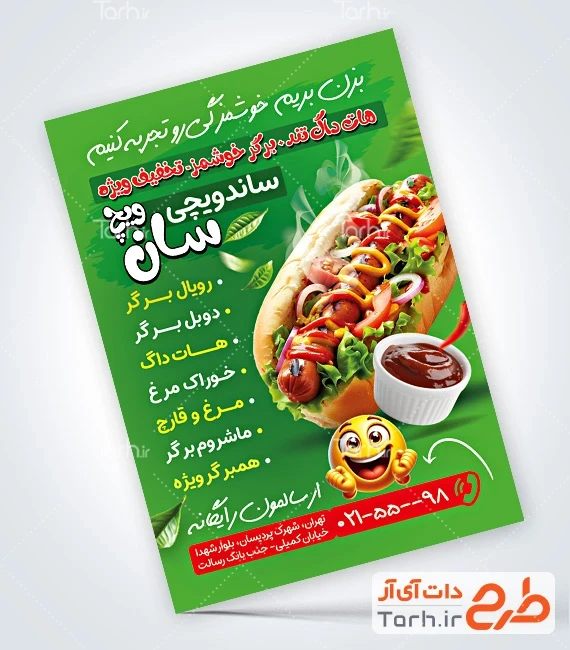 نمونه تراکت تبلیغاتی ساندویچی دارای عکس ساندویچ هات داگ کد فایل 2071649