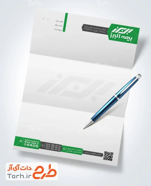 طرح آماده سربرگ دفتر بیمه البرز با فرمت psd و قابل ویرایش در نرمافزار فتوشاپ بهصورت لایه باز توسط تیم طراحان طرح دات آی آر طراحی شده است. در طرح لایه باز سربرگ دفتر بیمه از المانهای باکیفیت و متناسب با استاندارد چاپ استفادهشده، همچنین نکات مهم در طرح سربرگ خام بیمه البرز مانند رنگبندی، رعایت حاشیه، فاصلهها، فضای کافی برای درج متن، سایز و نوع فونت مناسب طراحی سربرگ و ... رعایت گردیده است. سربرگ لایه باز بیمه البرز شامل لوگو بیمه البرز و محل جایگذاری مشخصات میباشد که المانهای استفادهشده در نمونه سربرگ بیمه البرز قابلیت ویرایش، جابهجایی و تغییر سایز را دارا بوده و شما میتوانید متناسب باسلیقه خودتان طرح سربرگ دفتر بیمه را ویرایش نمایید، همچنین با تغییر لوگو و متنها میتوانید طرح سربرگ کارگزاری بیمه البرز را به طرح سربرگ کسب و کار مد نظر خود شخصی سازی نمایید. در اسناد و نامههای اداری و تجاری، سربرگ به عنوان وسیلهای برای نمایش اطلاعاتی مانند نام و لوگو یک شرکت یا سازمان، عنوان سند، تاریخ، شماره صفحه و اطلاعات تماس ( شماره تلفن، آدرس پستی، وبسایت و ایمیل) به کار میرود. این اطلاعات به دریافتکننده کمک میکند تا به راحتی با شرکت یا سازمان تماس بگیرد یا از منابع اطلاعاتی بیشتری بهرهبرداری کند.