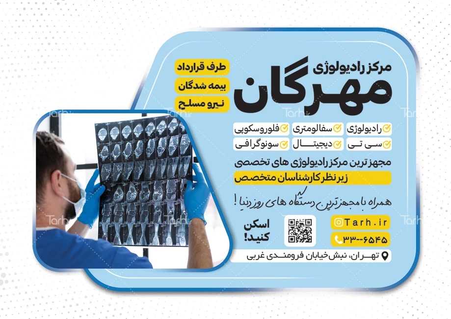 نمونه تراکت کلینیک رادیولوژی با فرمت psd و قابل ویرایش در نرمافزار فتوشاپ بهصورت لایه باز توسط تیم طراحان طرح دات آی آر طراحی شده است. در نمونه تراکت رادیولوژی از تصاویر و المانهای باکیفیت و متناسب با استاندارد چاپ استفادهشده، همچنین نکات مهم در طرح تراکت رادیولوژی مانند رنگبندی، رعایت حاشیه، فاصلهها، فضای کافی برای درج متن، سایز و نوع فونت مناسب طراحی تراکت و ... رعایت گردیده است. طرح لایه باز تراکت مرکز رادیولوژی شامل عکس دکتر و عکس رادیولوژی میباشد که المانهای استفادهشده در طرح تراکت سی تی اسکن قابلیت ویرایش، جابهجایی و تغییر سایز را دارا بوده و شما میتوانید متناسب باسلیقه خودتان تراکت لایه باز رادیولوژی را ویرایش نمایید، همچنین با تغییر تصاویر و متنها میتوانید طرح تراکت کلینیک رادیولوژی را به طرح تراکت کسب و کار مد نظر خود شخصی سازی نمایید.