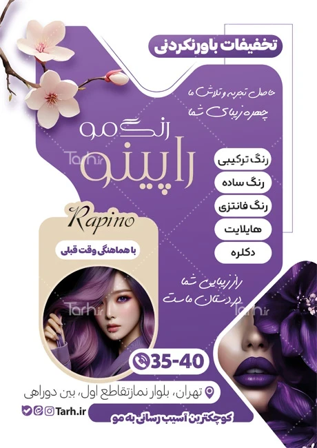 طرح آماده تراکت خدمات رنگ مو با تم سفید بنفش کد فایل 2135068