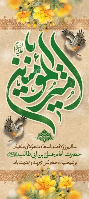 استند ولادت امام علی لایه باز با فرمت psd و قابل ویرایش در نرم افزار فتوشاپ به صورت لایه باز توسط تیم طراحان طرح دات آی آر طراحی شده است. در دانلود طرح بنر میلاد حضرت علی و روز پدر از تصاویر و المان های با کیفیت و متناسب با استاندارد چاپ استفاده گردیده است. طرح بنر ایستاده ولادت حضرت علی شامل تایپوگرافی خوشنویسی امیرالمومنین، وکتور گل و پرنده میباشد که المان های استفاده شده در بنر خام ولادت حضرت علی قابلیت ویرایش، جابه جایی و تغییر سایز را دارا بوده و شما می توانید متناسب با سلیقه خودتان طرح بنر استندی میلاد حضرت علی را ویرایش نمایید.