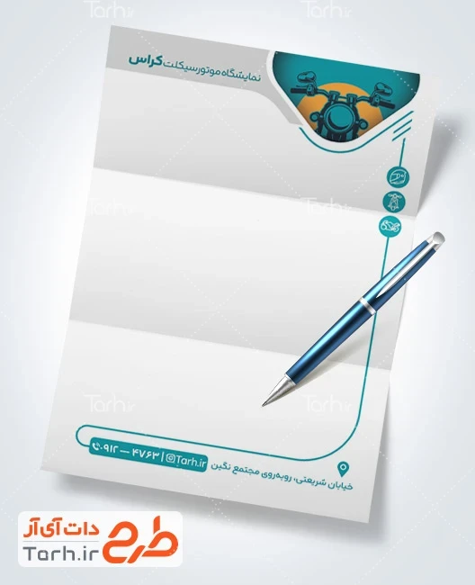 دانلود سربرگ آماده فروشگاه موتورسیکلت با فرمت psd و قابل ویرایش در نرمافزار فتوشاپ بهصورت لایه باز توسط تیم طراحان طرح دات آی آر طراحی شده است. در طرح لایه باز سربرگ فروشگاه موتور سیکلت از المانهای باکیفیت و متناسب با استاندارد چاپ استفادهشده، همچنین نکات مهم در طرح سربرگ خام فروشگاه موتور سیکلت مانند رنگبندی، رعایت حاشیه، فاصلهها، فضای کافی برای درج متن، سایز و نوع فونت مناسب طراحی سربرگ موتور سیکلت و ... رعایت گردیده است. سربرگ لایه باز فروشگاه موتور سیکلت شامل تصویرسازی موتور و محل جایگذاری مشخصات میباشد که المانهای استفادهشده در نمونه سربرگ نمایشگاه موتور سیکلت قابلیت ویرایش، جابهجایی و تغییر سایز را دارا بوده و شما میتوانید متناسب باسلیقه خودتان طرح سربرگ فروشگاه موتور سیکلت را ویرایش نمایید، همچنین با تغییر لوگو و متنها میتوانید طرح سربرگ موتور فروشی را به طرح سربرگ کسب و کار مد نظر خود شخصی سازی نمایید. در اسناد و نامههای اداری و تجاری، سربرگ به عنوان وسیلهای برای نمایش اطلاعاتی مانند نام و لوگو یک شرکت یا سازمان، عنوان سند، تاریخ، شماره صفحه و اطلاعات تماس ( شماره تلفن، آدرس پستی، وبسایت و ایمیل) به کار میرود. این اطلاعات به دریافتکننده کمک میکند تا به راحتی با شرکت یا سازمان تماس بگیرد یا از منابع اطلاعاتی بیشتری بهره برداری کند.