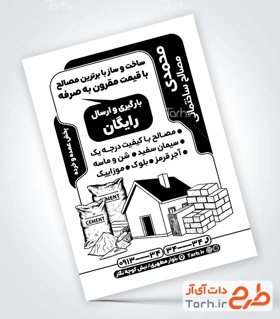 ابعاد تراکت تبلیغاتی سیاه و سفید مصالح فروشی در جدول ویژگیهای فایل درجشده و با توجه به لایه باز بودن و کیفیت بالای طرح مصالح ساختمانی، قابلیت ویرایش و تبدیل به سایز دلخواه، همچنین چاپ روی متریالهای مختلف مانند انواع کاغذ، گلاسه، کاغذ الوان و ... را دارا میباشد. همچنین میتوان تراکت سیاه سفید فروشگاه مصالح ساختمانی را در زمینه های چاپ سیلک ، نایلون، ساک دستی، پاکت دستی و کیسه نیز استفاده کرد. تراکت های سیاه سفید یا ریسو یک ابزار تبلیغاتی بسیار موثر محسوب می شوند و به دلیل هزینه کم و تأثیر بالا، در بسیاری از کسب و کارها به عنوان روشی اقتصادی و موثر برای انتقال اطلاعات به مخاطبان برای تبلیغات و رویدادهای مختلف استفاده میشوند.