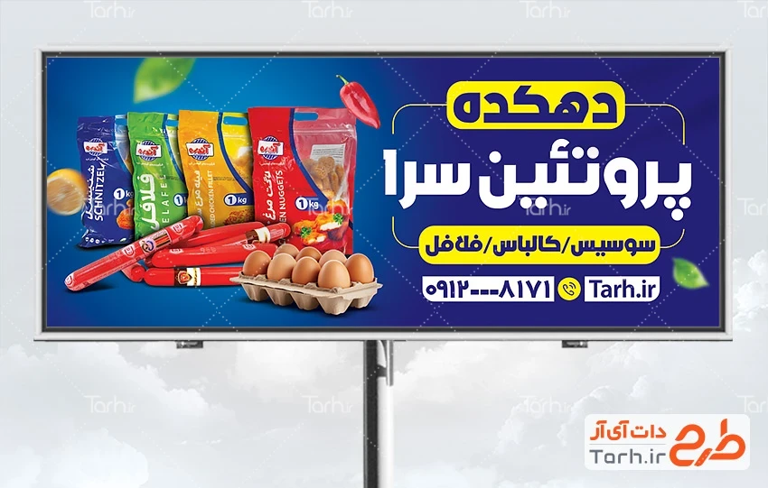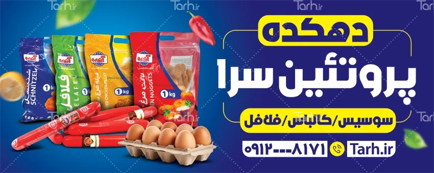 دانلود طرح تابلو فروش محصولات پروتئینی با فرمت psd و قابل ویرایش در نرمافزار فتوشاپ بهصورت لایه باز توسط تیم طراحان طرح دات آی آر طراحی شده است. در طرح لایه باز بنر سوپر پروتئین از تصاویر و المانهای باکیفیت و متناسب با استاندارد چاپ استفادهشده، همچنین نکات مهم در طرح لایه باز بنر مغازه مانند رنگبندی، رعایت حاشیه، فاصلهها، سایز و نوع فونت مناسب طراحی تابلو مشاغل و ... رعایت گردیده است. طرح بنر سوپر پروتئین شامل عکس سوسیس و کالباس میباشد که المانهای استفادهشده در طرح تابلو سوپرپروتئین قابلیت ویرایش، جابهجایی و تغییر سایز را دارا بوده و شما میتوانید متناسب باسلیقه خودتان بنر لایه باز سوپر پروتئین را ویرایش نمایید، همچنین با تغییر تصاویر و متنها میتوانید طرح تابلو محصولات پروتئینی را به طرح تابلوی شغل موردنظر خود تبدیل نمایید.