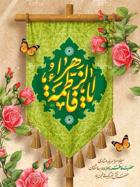 طرح پوستر تبریک میلاد حضرت فاطمه با خوشنویسی یا فاطمه الزهرا کد فایل 2398761