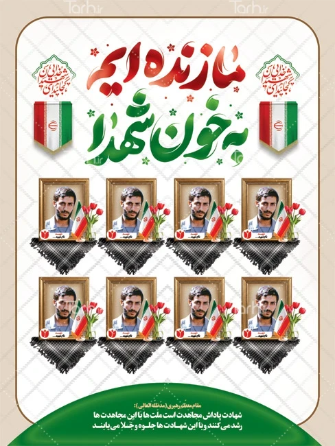 طرح پوستر یادواره شهدا با خوشنویسی ما زنده ایم به خون شهدا کد فایل 2409736