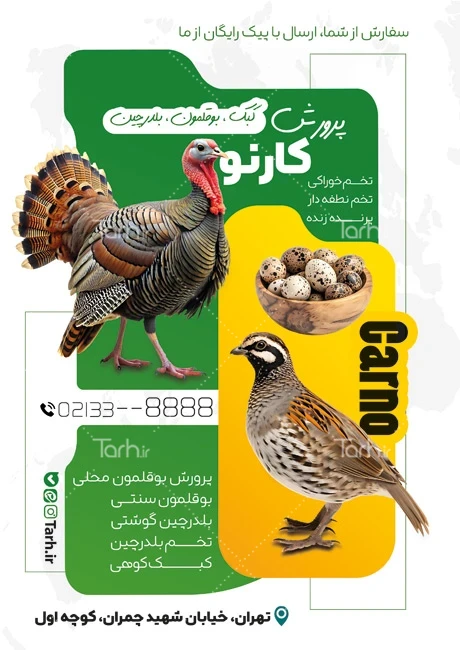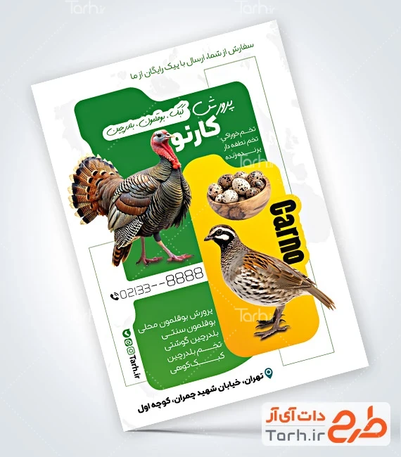 طرح تراکت تبلیغاتی پرورش مرغ و طیور با فرمت psd و قابل ویرایش در نرمافزار فتوشاپ بهصورت لایه باز توسط تیم طراحان طرح دات آی آر طراحی شده است. در طرح تراکت پرورش مرغ و طیور گوشتی از تصاویر و المانهای باکیفیت و متناسب با استاندارد چاپ استفادهشده، همچنین نکات مهم در طرح تراکت پرورش بوقلمون بلدرچین کبک مانند رنگبندی، رعایت حاشیه، فاصلهها، فضای کافی برای درج متن، سایز و نوع فونت مناسب طراحی تراکت و ... رعایت گردیده است. طرح لایه باز تراکت پرورش و نگهداری طیور شامل عکس بوقلمون، کبک و بلدرچین میباشد که المانهای استفاده شده در طرح تراکت پرورش ماکیان قابلیت ویرایش، جابهجایی و تغییر سایز را دارا بوده و شما میتوانید متناسب باسلیقه خودتان تراکت لایه باز پرورش مرغ و بوقلمون را ویرایش نمایید، همچنین با تغییر تصاویر و متنها میتوانید طرح تراکت پرورش بوقلمون را به طرح تراکت کسب و کار مد نظر خود شخصی سازی نمایید.