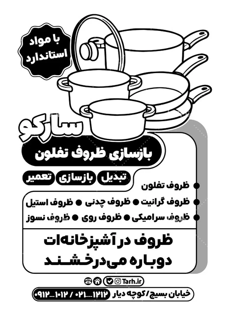 ابعاد تراکت تبلیغاتی سیاه و سفید بازسازی تفلون در جدول ویژگیهای فایل درجشده و با توجه به لایه باز بودن و کیفیت بالای طرح تراکت ریسو بازسازی ظروف تفلون، قابلیت ویرایش و تبدیل به سایز دلخواه، همچنین چاپ روی متریالهای مختلف مانند انواع کاغذ، گلاسه، کاغذ الوان و ... را دارا میباشد. همچنین میتوان طرح سیاه سفید بازسازی تفلون را در زمینه های چاپ سیلک ، نایلون، ساک دستی، پاکت دستی و کیسه نیز استفاده کرد. تراکت های سیاه سفید یا ریسو یک ابزار تبلیغاتی بسیار موثر محسوب می شوند و به دلیل هزینه کم و تأثیر بالا، در بسیاری از کسب و کارها به عنوان روشی اقتصادی و موثر برای انتقال اطلاعات به مخاطبان برای تبلیغات و رویدادهای مختلف استفاده میشوند.
