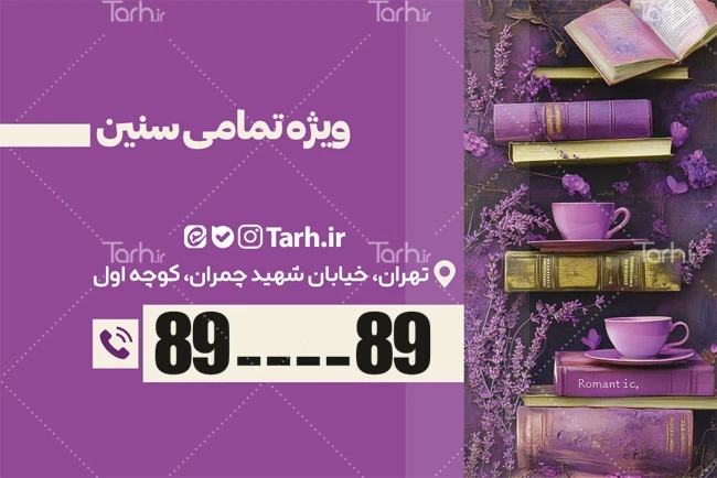 نمونه کارت ویزیت کتابفروشی با تم بنفش کد فایل 2487650