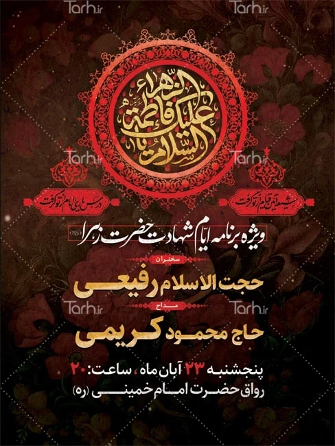 طرح پوستر اطلاعیه ایام فاطمیه با فرمت psd و قابل ویرایش در نرم افزار فتوشاپ به صورت لایه باز توسط تیم طراحان طرح دات آی آر طراحی شده است. در طرح لایه باز اطلاعیه فاطمیه از تصاویر و المان های با کیفیت و متناسب با استاندارد چاپ استفاده گردیده است. طرح اطلاعیه خام ایام فاطمیه شامل تایپوگرافی السلام علیک یا فاطمه الزهرا و دارای زمان و مکان مراسم روضه و عزاداری می باشد که المان های استفاده شده در طرح لایه باز پوستر شهادت حضرت فاطمه قابلیت ویرایش، جابه جایی و تغییر سایز را دارا بوده و شما می توانید متناسب با سلیقه خودتان طرح اطلاعیه شهادت حضرت فاطمه را ویرایش نمایید.