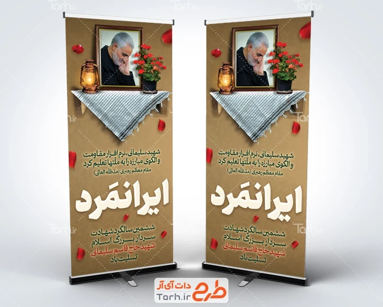دانلود استند سالگرد شهادت سردار سلیمانی با فرمت psd و قابل ویرایش در نرم افزار فتوشاپ به صورت لایه باز توسط تیم طراحان طرح دات آی آر طراحی شده است. در طرح لایه باز شهادت سردار سلیمانی از تصاویر و المان های با کیفیت و متناسب با استاندارد چاپ استفاده گردیده است. طرح استند سردار سلیمانی شامل قاب عکس سردار سلیمانی و شعار ایرانمرد می باشد که المان های استفاده شده در بنر لایه باز شهادت سردار سلیمانی قابلیت ویرایش، جابه جایی و تغییر سایز را دارا بوده و شما می توانید متناسب با سلیقه خودتان طرح بنر ایستاده سالروز شهادت سردار سلیمانی را ویرایش نمایید.