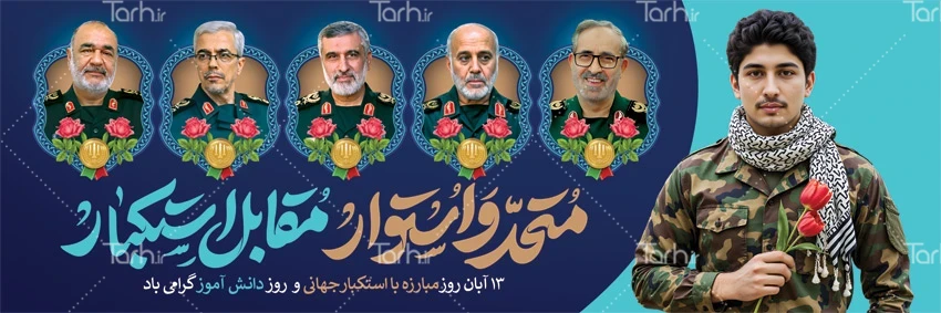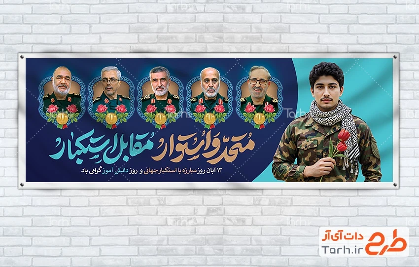 ابعاد قابل چاپ پلاکارد 13 آبان روز دانش آموز و سرداران شهید حمله اسرائیل به ایران و کاربرد آن