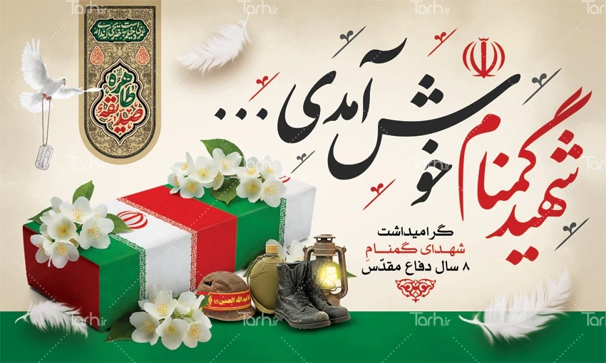 بنر لایه باز تشییع شهدای گمنام در ایام فاطمیه با خوشنویسی شهید گمنام خوش آمدی کد فایل 2586701