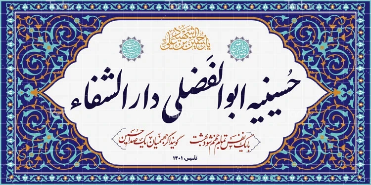 تابلو خام حسینیه شامل طرح اسلیمی و خوشنویسی حسینیه ابوالفضلی دارالشفا جهت چاپ بنر و تابلو مسجد و حسینیه