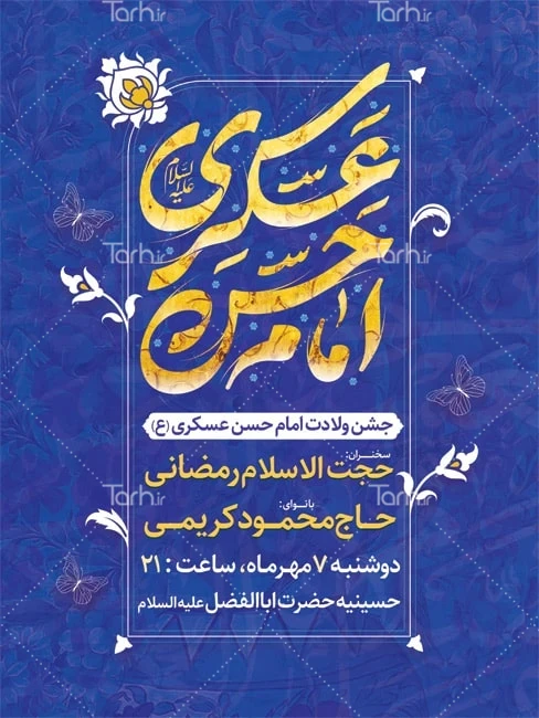 طرح پوستر اطلاعیه ولادت امام حسن عسکری با فرمت psd و قابل ویرایش در نرم افزار فتوشاپ به صورت لایه باز توسط تیم طراحان طرح دات آی آر طراحی شده است. در طرح لایه باز ولادت امام حسن عسکری از تصاویر و المان های با کیفیت و متناسب با استاندارد چاپ استفاده گردیده است. طرح لایه باز بنر اطلاع رسانی ولادت امام حسن عسکری شامل تایپوگرافی امام حسن عسکری و وکتور گل می باشد که المان های استفاده شده در پوستر لایه باز ولادت امام حسن عسکری قابلیت ویرایش، جابه جایی و تغییر سایز را دارا بوده و شما می توانید متناسب با سلیقه خودتان طرح لایه باز پوستر اطلاعیه ولادت امام حسن عسکری را ویرایش نمایید.