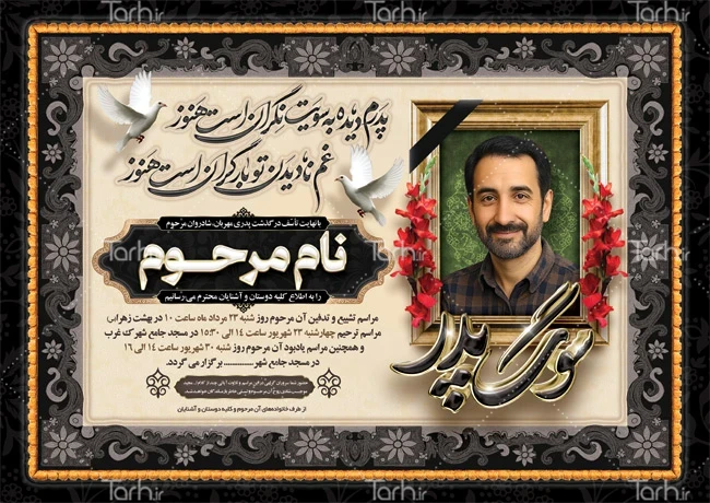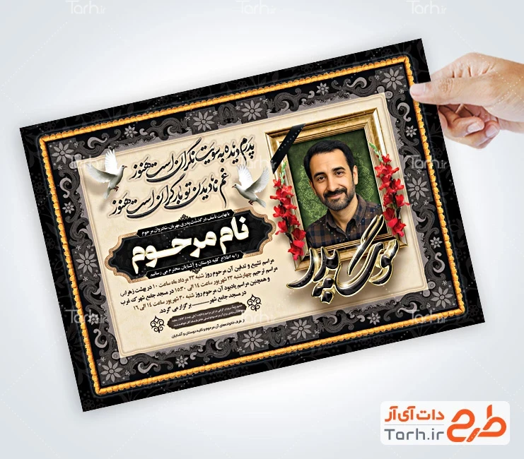 دانلود طرح آگهی ترحیم پدر با فرمت psd و قابل ویرایش در نرمافزار فتوشاپ بهصورت لایه باز توسط تیم طراحان طرح دات آی آر طراحی شده است. در فایل لایه باز اعلامیه ترحیم پدر از تصاویر و المانهای باکیفیت و متناسب با استاندارد چاپ استفادهشده، همچنین نکات مهم در طرح آگهی ترحیم پدر مانند رنگبندی، رعایت حاشیه، فاصلهها، فضای کافی برای درج متن، سایز و نوع فونت مناسب طراحی آگهی ترحیم و ... رعایت گردیده است. طرح آگهی ترحیم پدر شامل جایگاه عکس پدر، خوشنویسی سوگ پدر و خوشنویسی شعر پدرم دیه به سویت نگران هست هنوز، غم نادیدن تو بار گران هست هنوز میباشد که المانهای استفادهشده در آگهی ترحیم لایه باز پدر قابلیت ویرایش، جابهجایی و تغییر سایز را دارا بوده و شما میتوانید متناسب باسلیقه خودتان نمونه اعلامیه ترحیم پدر را ویرایش نمایید.