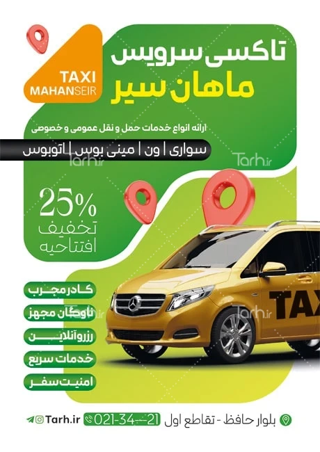 طرح لایه باز تراکت تاکسی تلفنی با فرمت psd و قابل ویرایش در نرمافزار فتوشاپ بهصورت لایه باز توسط تیم طراحان طرح دات آی آر طراحی شده است. در نمونه تراکت تاکسی از تصاویر و المانهای باکیفیت و متناسب با استاندارد چاپ استفادهشده، همچنین نکات مهم در طرح تراکت لایه باز تاکسی تلفنی مانند رنگبندی مشکی طلایی، رعایت حاشیه، فاصلهها، فضای کافی برای درج متن، سایز و نوع فونت مناسب طراحی تراکت و ... رعایت گردیده است. طرح لایه باز تراکت آژانس شامل عکس تاکسی میباشد که المانهای استفادهشده در طرح تراکت تاکسی تلفنی قابلیت ویرایش، جابهجایی و تغییر سایز را دارا بوده و شما میتوانید متناسب باسلیقه خودتان تراکت لایه باز تاکسی سرویس را ویرایش نمایید، همچنین با تغییر تصاویر و متنها میتوانید طرح تراکت آژانس را به طرح تراکت کسب و کار مد نظر خود شخصی سازی نمایید.