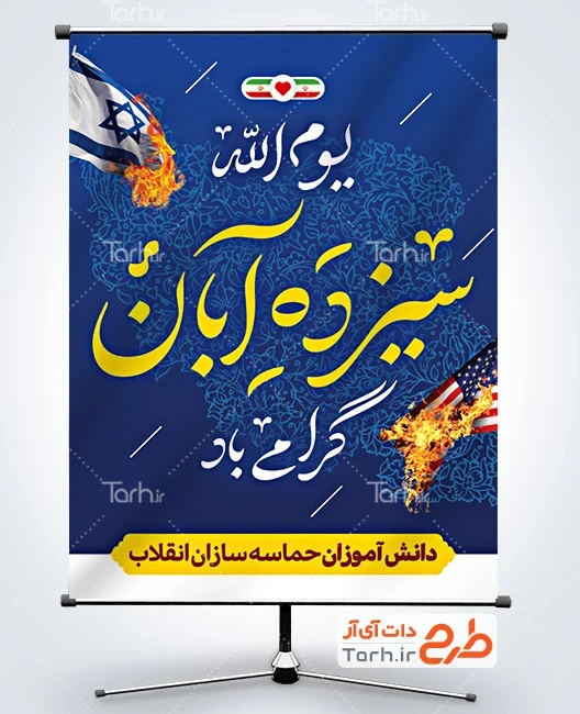 طرح آماده پوستر 13 آبان با فرمت psd و قابل ویرایش در نرم افزار فتوشاپ به صورت لایه باز توسط تیم طراحان طرح دات آی آر طراحی شده است. در طرح بنر 13 آبان از تصاویر و المان های با کیفیت و متناسب با استاندارد چاپ استفاده گردیده است. طرح بنر روز دانش آموز شامل خوشنویسی یوم الله سیزده آبان گرامی باد، عکس پرچم اسرائیل و آمریکا آتش گرفته شده می باشد که المان های استفاده شده در طرح لایه باز بنر روز دانش آموز قابلیت ویرایش، جابه جایی و تغییر سایز را دارا بوده و شما می توانید متناسب با سلیقه خودتان طرح 13 آبان را ویرایش نمایید.