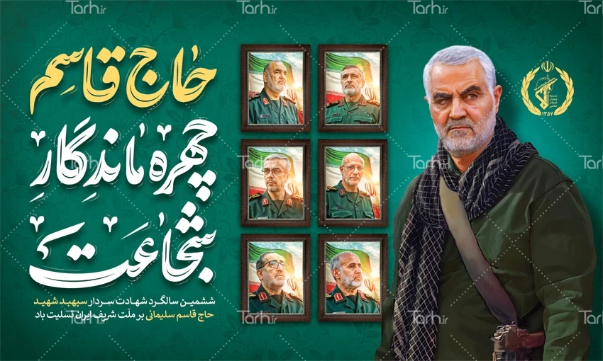 بنر لایه باز سردار سلیمانی و سرداران شهید جنگ 12 روزه با تایپوگرافی حاج قاسم چهره ماندگار شجاعت کد فایل 2748539