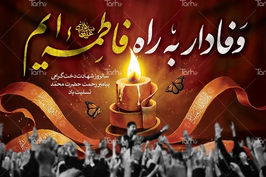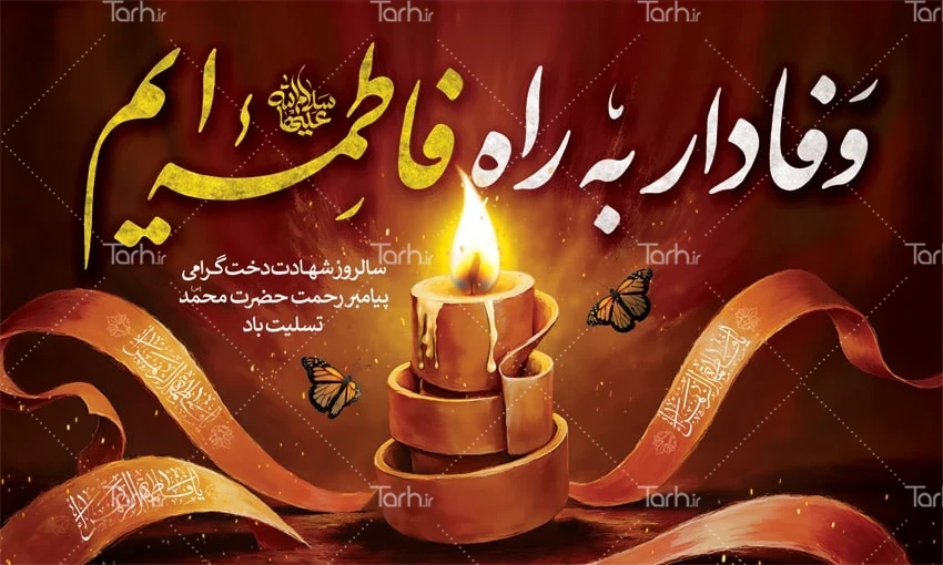 طرح بنر آماده پشت سن عزاداری شهادت حضرت زهرا با فرمت psd و قابل ویرایش در نرم افزار فتوشاپ به صورت لایه باز توسط تیم طراحان طرح دات آی آر طراحی شده است. در طرح لایه باز بنر شهادت حضرت زهرا از تصاویر و المان های با کیفیت و متناسب با استاندارد چاپ استفاده گردیده است. طرح کتیبه فاطمیه شامل تایپوگرافی وفادار به راه فاطمه ایم، وکتور پروانه و تصویرسازی شمع میباشد که المان های استفاده شده در طرح بنر پشت مداح شهادت حضرت فاطمه قابلیت ویرایش، جابه جایی و تغییر سایز را دارا بوده و شما می توانید متناسب با سلیقه خودتان طرح بنر پشت منبر فاطمیه را ویرایش نمایید.