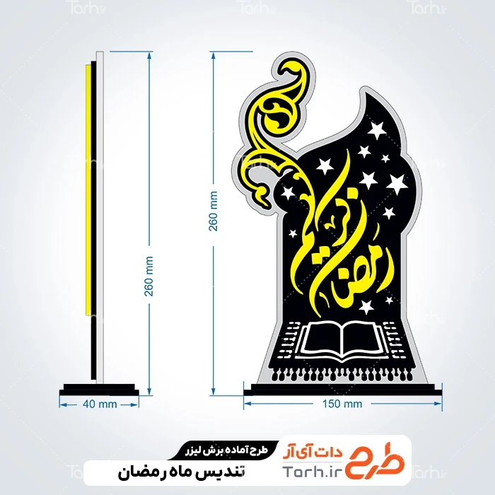 طرح لیزر تندیس ماه رمضان با نرم افزار Corel Draw به صورت لایه باز و قابل ویرایش توسط تیم طراحان طرح دات آی آر طراحی شده است. در طرح تندیس رمضان و طرح لیزر تندیس مذهبی نکات مهم طراحی لیزر مانند رعایت ضخامت چوب، ابعاد استاندارد طرح و چیدمان درست برای کمترین پرتی رعایت گردیده است. طرح آماده لیزر تندیس رمضان، آماده اجرا توسط دستگاه های برش، سی ان سی (CNC)، حکاکی لیزر و حکاکی روی چوب میباشد. شما میتوانید از طرح تندیس لیزری رمضان جهت تولید انواع تندیس و استند رمضان به عنوان هدیه در مراسمات مذهبی رمضان استفاده کنید.