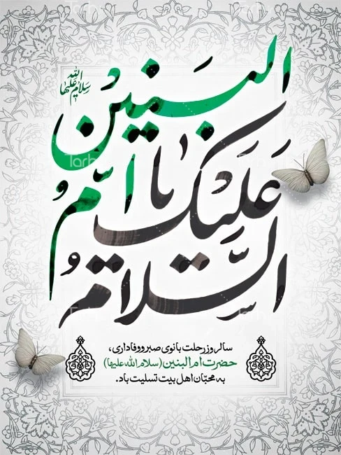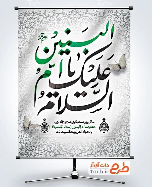 پوستر خام وفات حضرت ام البنین با فرمت psd و قابل ویرایش در نرم افزار فتوشاپ به صورت لایه باز توسط تیم طراحان طرح دات آی آر طراحی شده است. در طرح لایه باز وفات ام البنین از تصاویر و المان های با کیفیت و متناسب با استاندارد چاپ استفاده گردیده است. طرح بنر وفات حضرت ام البنین شامل تایپوگرافی السلام علیک یا ام البنین و وکتور پروانه می باشد که المان های استفاده شده در بنر رحلت حضرت ام البنین قابلیت ویرایش، جابه جایی و تغییر سایز را دارا بوده و شما می توانید متناسب با سلیقه خودتان طرح وفات ام البنین را ویرایش نمایید.