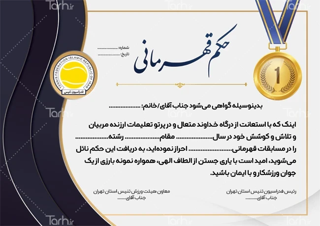 ابعاد طرح لوح تقدیر تنیس در جدول ویژگی های فایل درج شده و با توجه به لایه باز بودن و کیفیت بالای لوح تقدیر تنیس لایه باز، قابلیت ویرایش و تبدیل به سایز دلخواه و همچنین چاپ در ابعاد و متریال های مختلف را دارا می باشد. حکم قهرمانی یک نوع جلد یا تابلویی است که به عنوان نمادی از تقدیر، تشکر، تجلیل یا تقدیر به افراد یا گروههایی که خدمات و انجام وظایف خاصی انجام دادهاند، اهدا میشود. حکم قهرمانی علاوه بر تشکر و تجلیل از افراد، میتواند احساس ارزشمندی و انگیزهبخشی را نیز در دریافت کننده تقدیر ایجاد کند.