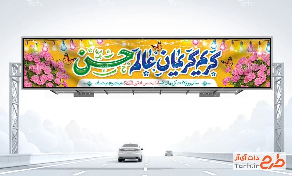دانلود طرح بنر بیلبورد ولادت امام حسن مجتبی با فرمت psd و قابل ویرایش در نرم افزار فتوشاپ به صورت لایه باز توسط تیم طراحان طرح دات آی آر طراحی شده است. در بنر بیلبورد ولادت امام حسن مجتبی از تصاویر و المان های با کیفیت و متناسب با استاندارد چاپ استفاده گردیده است. بنر تبریک میلاد امام حسن شامل خوشنویسی کریم کریمان عالم حسن، وکتور گل و پروانه می باشد که المان های استفاده شده در طرح بنر ولادت امام حسن مجتبی قابلیت ویرایش، جابه جایی و تغییر سایز را دارا بوده و شما می توانید متناسب با سلیقه خودتان بنر لایه باز ولادت امام حسن مجتبی را ویرایش نمایید.
