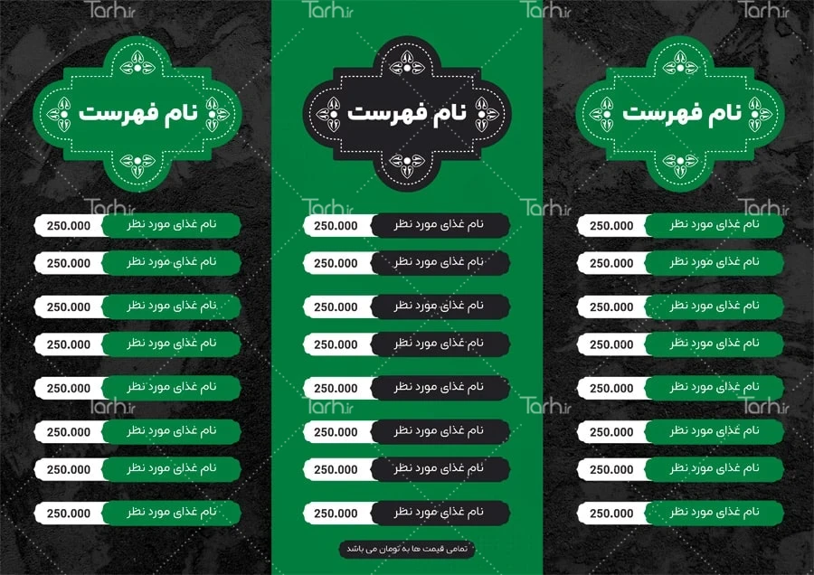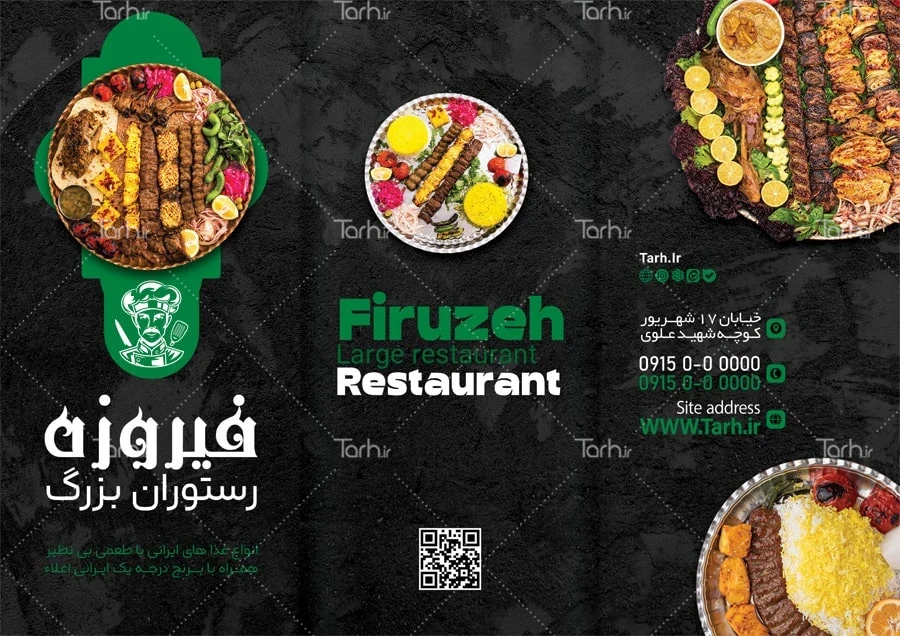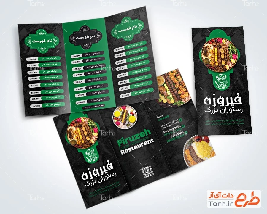 فایل بروشور منو رستوران با فرمت psd و قابل ویرایش در نرم افزار فتوشاپ به صورت لایه باز توسط تیم طراحان طرح دات آی آر طراحی شده است. در بروشور لایه باز منوی غذا که غالباً در قالب سه و چهار لت (چند لتی) طراحی میشود از تصاویر و المان های با کیفیت و متناسب با استاندارد چاپ استفاده گردیده است. طرح بروشور منو رستوران شامل عکس بشقاب غذای ایرانی و لیست قیمت غذاها می باشد که المان های استفاده شده در بروشور لایه باز منو رستوران قابلیت حذف، ویرایش، جابه جایی و تغییر سایز را دارا بوده و شما می توانید متناسب با سلیقه خودتان طرح بروشور منو غذا را ویرایش نمایید.