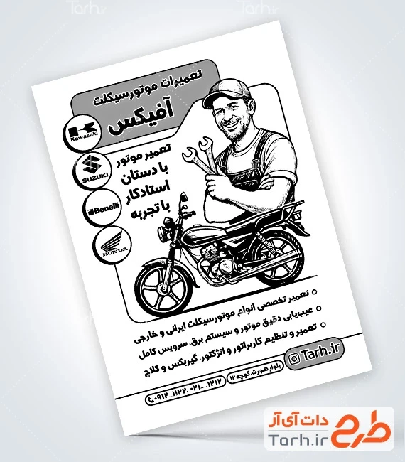 ابعاد قابل چاپ طرح تراکت سیاه سفید تعمیرگاه موتور سیکلت و کاربرد آن