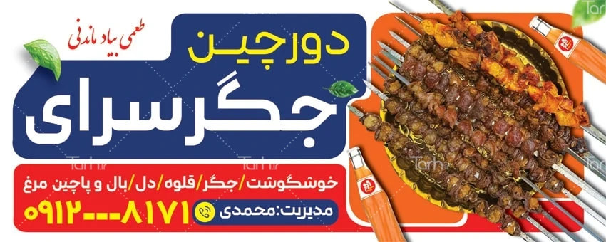 طرح آماده تابلو تبلیغاتی جیگرکی با فرمت psd و قابل ویرایش در نرمافزار فتوشاپ بهصورت لایه باز توسط تیم طراحان طرح دات آی آر طراحی شده است. در طرح لایه باز بنر جگرکی از تصاویر و المانهای باکیفیت و متناسب با استاندارد چاپ استفادهشده، همچنین نکات مهم در طرح بنر مشاغل مانند رنگبندی، رعایت حاشیه، فاصلهها، سایز و نوع فونت مناسب طراحی تابلو مشاغل و ... رعایت گردیده است. طرح بنر جگرکی شامل عکس دیس جگر و دورچین میباشد که المانهای استفادهشده در طرح بنر جگرکی قابلیت ویرایش، جابهجایی و تغییر سایز را دارا بوده و شما میتوانید متناسب باسلیقه خودتان طرح بنر تبلیغاتی جگرکی را ویرایش نمایید، همچنین با تغییر تصاویر و متنها میتوانید طرح تابلو تبلیغاتی جگر فروشی را به طرح تابلوی شغل موردنظر خود تبدیل نمایید.