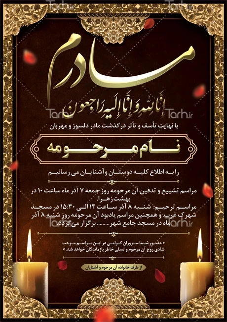 طرح رایگان آگهی ترحیم مادر با فرمت psd و قابل ویرایش در نرمافزار فتوشاپ بهصورت لایه باز توسط تیم طراحان طرح دات آی آر طراحی شده است. در فایل اعلامیه ترحیم مادر از تصاویر و المانهای باکیفیت و متناسب با استاندارد چاپ استفادهشده، همچنین نکات مهم در طرح آگهی ترحیم مادر مانند رنگبندی، رعایت حاشیه، فاصلهها، فضای کافی برای درج متن، سایز و نوع فونت مناسب طراحی آگهی ترحیم و ... رعایت گردیده است. طرح لایه باز آگهی فوت مادر شامل خوشنویسی مادرم، عکس شمع و طرح اسلیمی میباشد که المانهای استفادهشده در آگهی ترحیم لایه باز مادر قابلیت ویرایش، جابهجایی و تغییر سایز را دارا بوده و شما میتوانید متناسب باسلیقه خودتان نمونه اعلامیه ترحیم رایگان مادر را ویرایش نمایید.