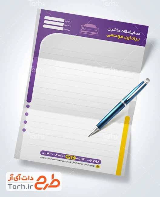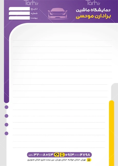 سربرگ لایه باز نمایشگاه اتومبیل با فرمت psd و قابل ویرایش در نرمافزار فتوشاپ بهصورت لایه باز توسط تیم طراحان طرح دات آی آر طراحی شده است. در طرح لایه باز سربرگ نمایشگاه اتومبیل از المانهای باکیفیت و متناسب با استاندارد چاپ استفادهشده، همچنین نکات مهم در طرح سربرگ خام نمایشگاه اتومبیل مانند رنگبندی، رعایت حاشیه، فاصلهها، فضای کافی برای درج متن، سایز و نوع فونت مناسب طراحی سربرگ و ... رعایت گردیده است. سربرگ لایه باز نمایشگاه اتومبیل شامل وکتور ماشین، لوگو و محل جایگذاری مشخصات میباشد که المانهای استفادهشده در نمونه سربرگ نمایشگاه ماشین قابلیت ویرایش، جابهجایی و تغییر سایز را دارا بوده و شما میتوانید متناسب باسلیقه خودتان طرح سربرگ بنگاه ماشین را ویرایش نمایید، همچنین با تغییر لوگو و متنها میتوانید طرح سربرگ بنگاه خودرو را به طرح سربرگ کسب و کار مد نظر خود شخصی سازی نمایید. در اسناد و نامههای اداری و تجاری، سربرگ به عنوان وسیلهای برای نمایش اطلاعاتی مانند نام و لوگو یک شرکت یا سازمان، عنوان سند، تاریخ، شماره صفحه و اطلاعات تماس ( شماره تلفن، آدرس پستی، وبسایت و ایمیل) به کار میرود. این اطلاعات به دریافتکننده کمک میکند تا به راحتی با شرکت یا سازمان تماس بگیرد یا از منابع اطلاعاتی بیشتری بهرهبرداری کند.