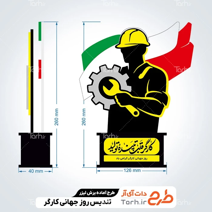 طرح لیزر تندیس روز کارگر با نرم افزار Corel Draw به صورت لایه باز و قابل ویرایش توسط تیم طراحان طرح دات آی آر طراحی شده است. در طرح آماده برش لیزری استند روز کارگر نکات مهم طراحی لیزر مانند رعایت ضخامت چوب، ابعاد طرح تندیس روز کارگر، طرح و چیدمان درست برای کمترین پرتی رعایت گردیده است. طرح برش لیزری تندیس کارگر، آماده اجرا توسط دستگاه های برش، سی ان سی (CNC)، حکاکی لیزر و حکاکی روی چوب میباشد. شما میتوانید از طرح تندیس لیزری روز کارگر جهت تولید انواع تندیس و استند روز کارگر به عنوان هدیه در روز جهانی کارگر استفاده کنید.