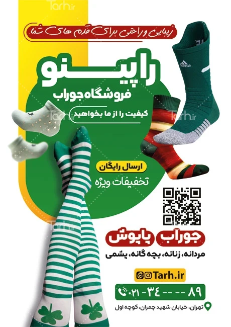 طرح خام تراکت جوراب فروشی با فرمت psd و قابل ویرایش در نرمافزار فتوشاپ بهصورت لایه باز توسط تیم طراحان طرح دات آی آر طراحی شده است. در نمونه تراکت جوراب فروشی از تصاویر و المانهای باکیفیت و متناسب با استاندارد چاپ استفادهشده، همچنین نکات مهم در طرح تراکت فروشگاه جوراب مانند رنگبندی، رعایت حاشیه، فاصلهها، فضای کافی برای درج متن، سایز و نوع فونت مناسب طراحی تراکت و ... رعایت گردیده است. طرح لایه باز تراکت جوراب فروشی شامل عکس جوراب ساق بلند میباشد که المانهای استفادهشده در طرح تراکت جوراب فروشی قابلیت ویرایش، جابهجایی و تغییر سایز را دارا بوده و شما میتوانید متناسب باسلیقه خودتان تراکت لایه باز فروش جوراب را ویرایش نمایید، همچنین با تغییر تصاویر و متنها میتوانید طرح تراکت فروشگاه جوراب را به طرح تراکت کسب و کار مد نظر خود شخصی سازی نمایید.