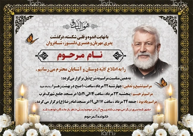 طرح اعلامیه ترحیم فوت پدر با فرمت psd و قابل ویرایش در نرمافزار فتوشاپ بهصورت لایه باز توسط تیم طراحان طرح دات آی آر طراحی شده است. در فایل لایه باز اعلامیه ترحیم پدر از تصاویر و المانهای باکیفیت و متناسب با استاندارد چاپ استفادهشده، همچنین نکات مهم در طرح آگهی ترحیم پدر مانند رنگبندی، رعایت حاشیه، فاصلهها، فضای کافی برای درج متن، سایز و نوع فونت مناسب طراحی آگهی ترحیم و ... رعایت گردیده است. طرح آگهی ترحیم پدر شامل جایگاه عکس پدر، خوشنویسی هوالباقی و وکتور شمع میباشد که المانهای استفادهشده در آگهی ترحیم لایه باز پدر قابلیت ویرایش، جابهجایی و تغییر سایز را دارا بوده و شما میتوانید متناسب باسلیقه خودتان نمونه اعلامیه ترحیم پدر را ویرایش نمایید.