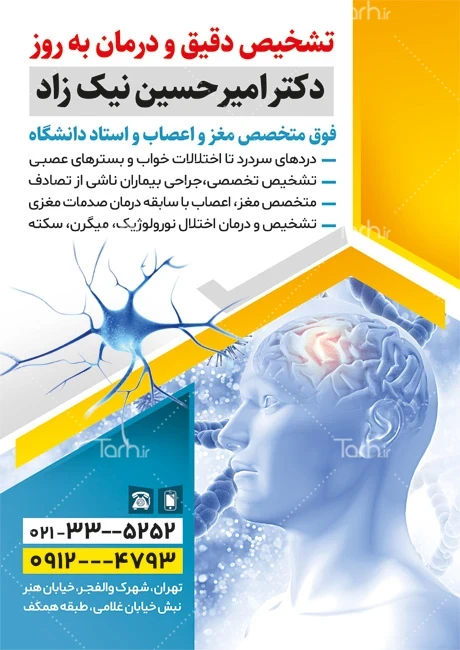 طرح تراکت آماده پزشک مغز و اعصاب با فرمت psd و قابل ویرایش در نرمافزار فتوشاپ بهصورت لایه باز توسط تیم طراحان طرح دات آی آر طراحی شده است. در نمونه تراکت دکتر مغز و اعصاب از تصاویر و المانهای باکیفیت و متناسب با استاندارد چاپ استفادهشده، همچنین نکات مهم در طرح تراکت دکتر مغز و اعصاب مانند رنگبندی، رعایت حاشیه، فاصلهها، فضای کافی برای درج متن، سایز و نوع فونت مناسب طراحی تراکت و ... رعایت گردیده است. طرح لایه باز تراکت متخصص مغز و اعصاب شامل متن تبلیغاتی متخصص مغز و اعصاب میباشد که المانهای استفادهشده در طرح تراکت متخصص مغز و اعصاب قابلیت ویرایش، جابهجایی و تغییر سایز را دارا بوده و شما میتوانید متناسب باسلیقه خودتان تراکت خام دکتر مغز و اعصاب را ویرایش نمایید، همچنین با تغییر تصاویر و متنها میتوانید طرح تراکت کلینیک مغز و اعصاب را به طرح تراکت کسب و کار مد نظر خود شخصی سازی نمایید.